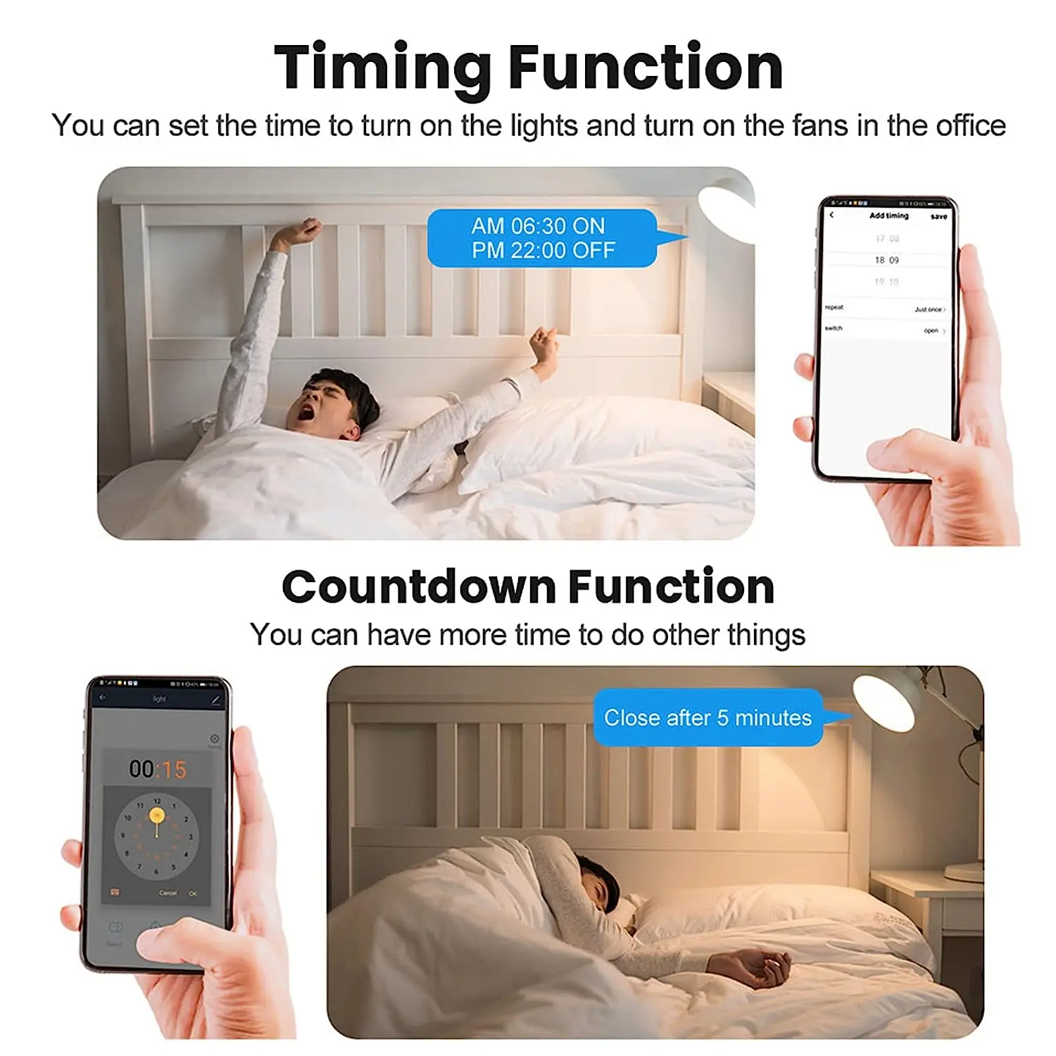 You can control the switch, timing, countdown and other functions of the device through your mobile phone. This can be ordered: turn off the lights in the living room after 2 hours. 18:15 Turn off the oven. Turn on the boiler at 21:00. You can also time the device when you are not at home. (APP: Smart Life/TUYA Smart)