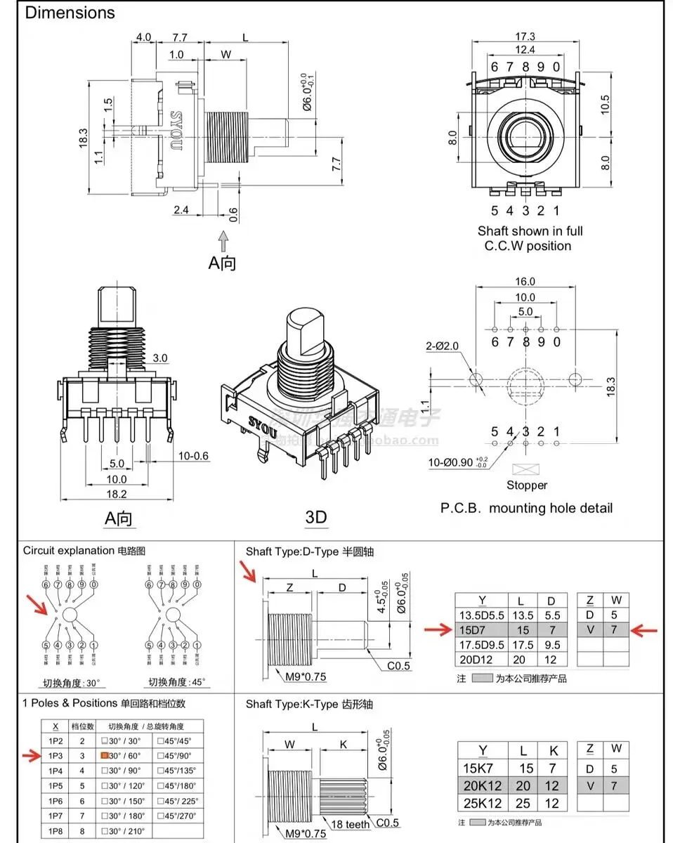 1pc RS17 Band Rotary Switch 1 Pole 3 4 5 6 7 8 Positions Small Household Appliance Conversion Gears Switch 10Pin 15/20MM D Shaft