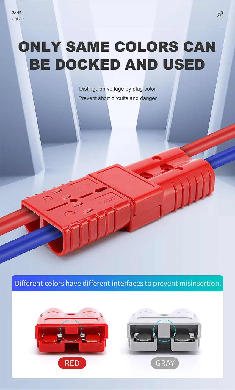 Note 1: This connector does not distinguish between male and female. Connectors of the same amperage and color can be connected to each other.