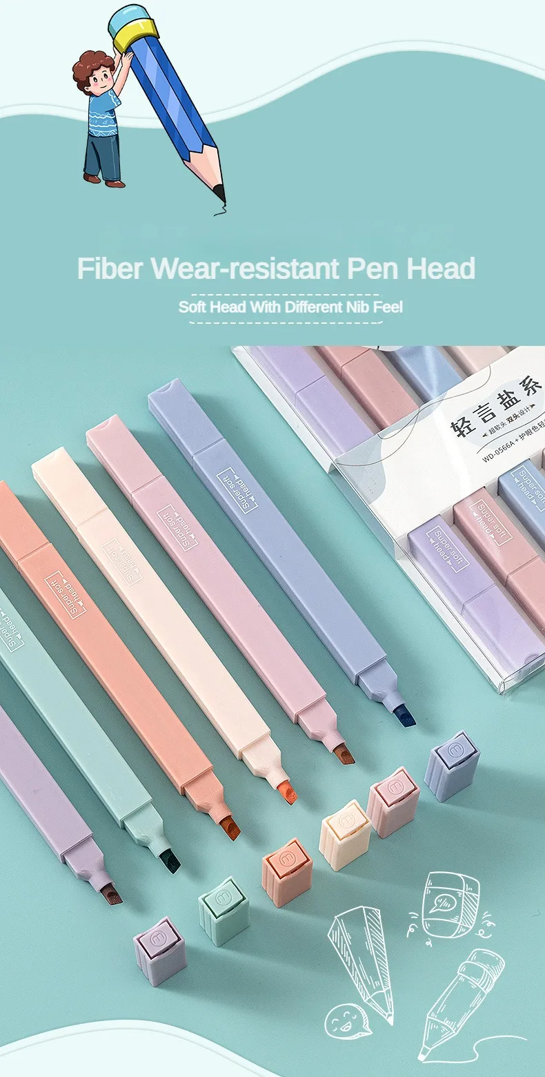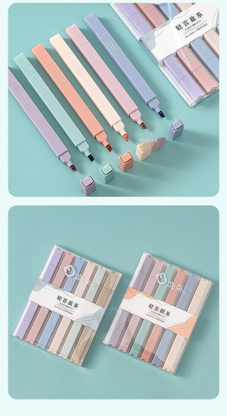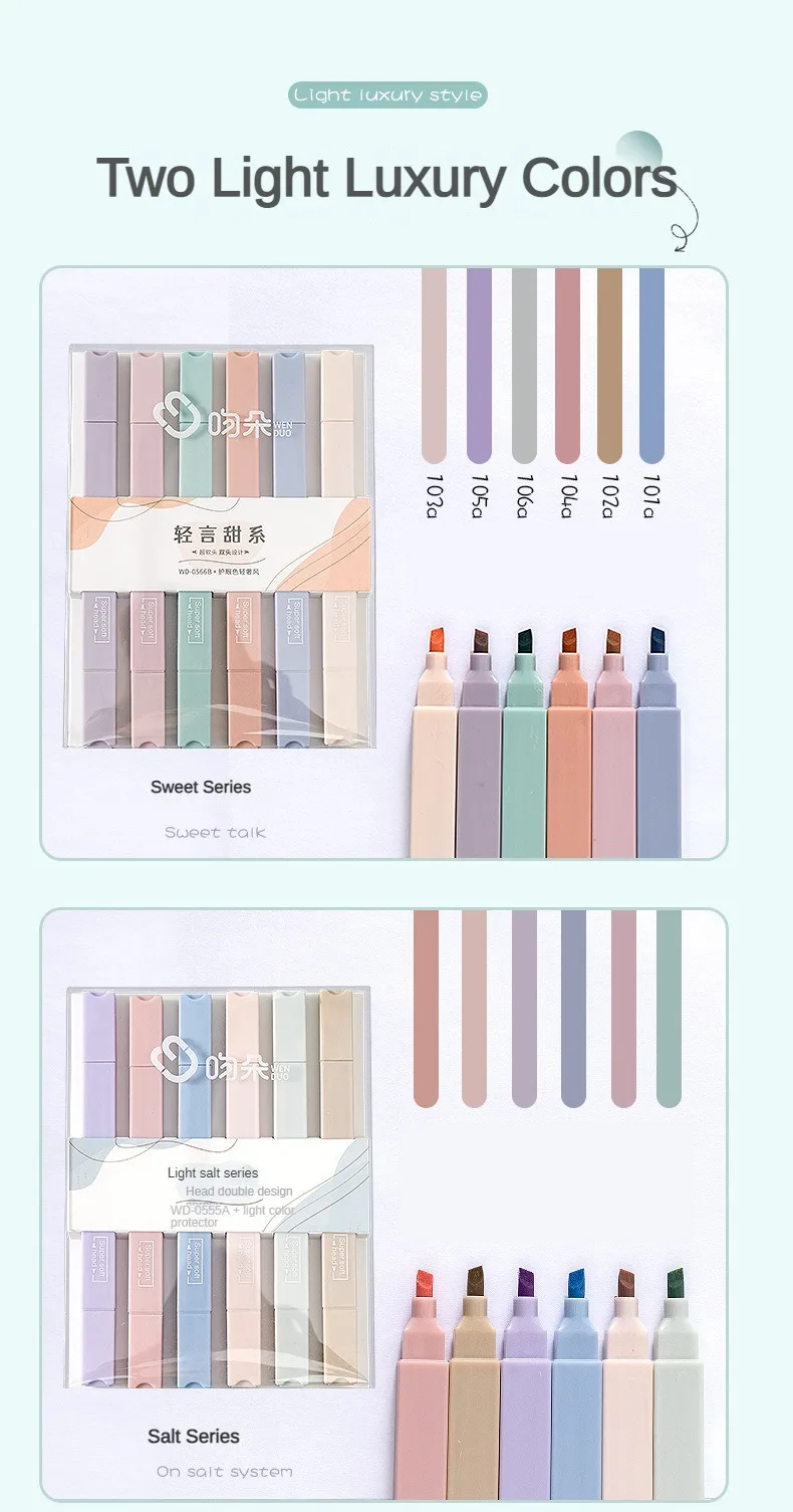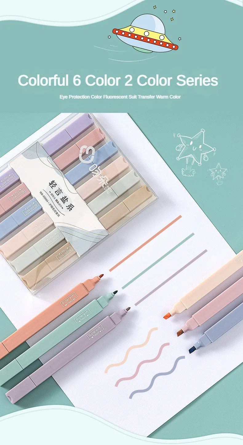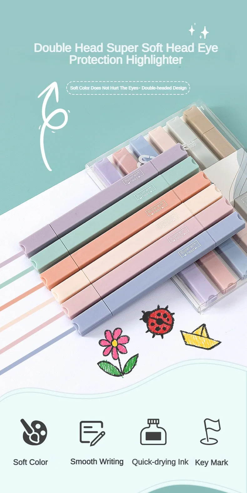 6 Pcs/Set Double Tip Highlighter Pens Kawaii Manga Markers Midliner Pastel Gel Journal Pens Stationery Office School Supplies