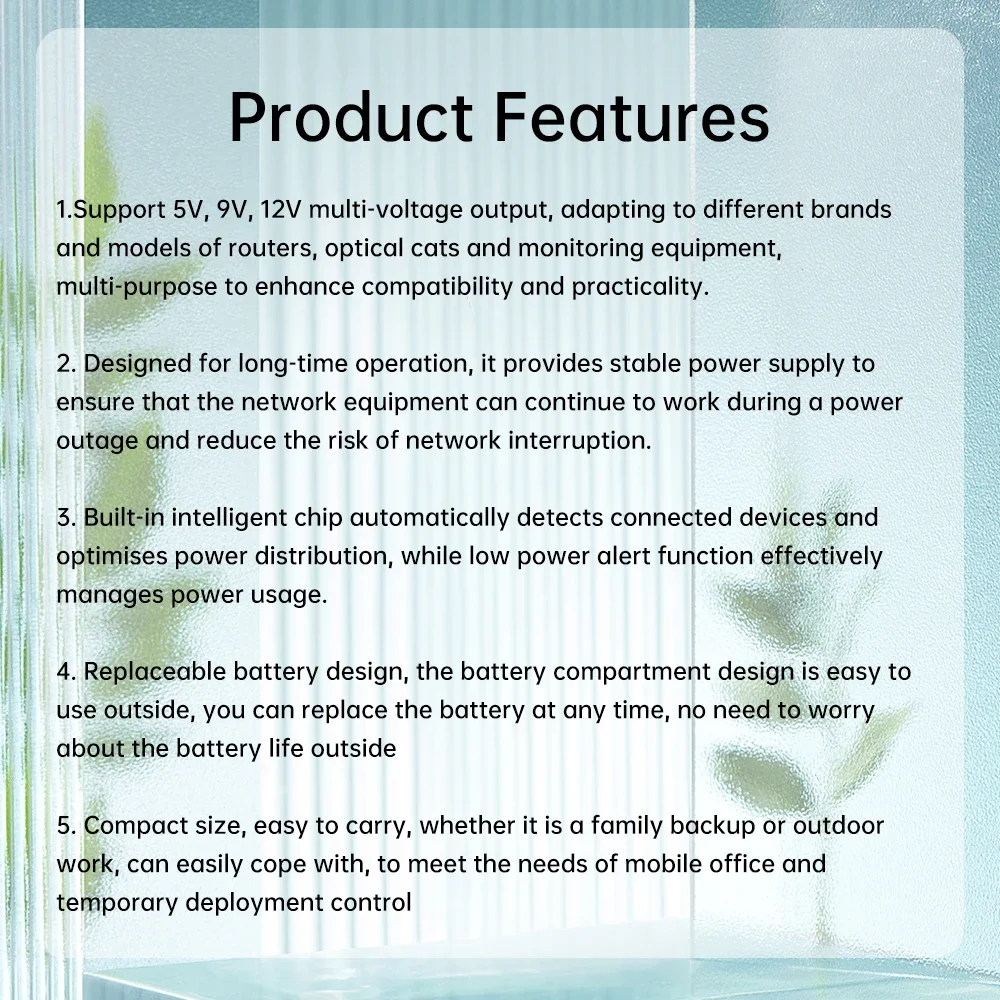 1.Support 5V, 9V, 12V multi-voltage output, adapt to different brands and models of routers, optical cats and monitoring equipment, multi-purpose, improve compatibility and practicality