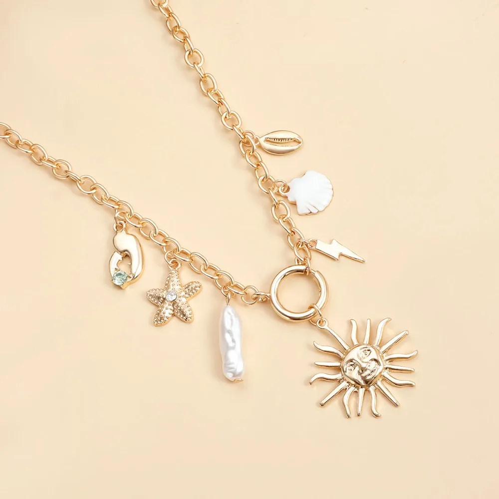 1. Beach-Inspired Layered Design: Features multiple layers of stylish gold-tone alloy chains adorned with starfish, seashell, and conch pendants for a breezy, ocean vibe perfect for summer holidays.