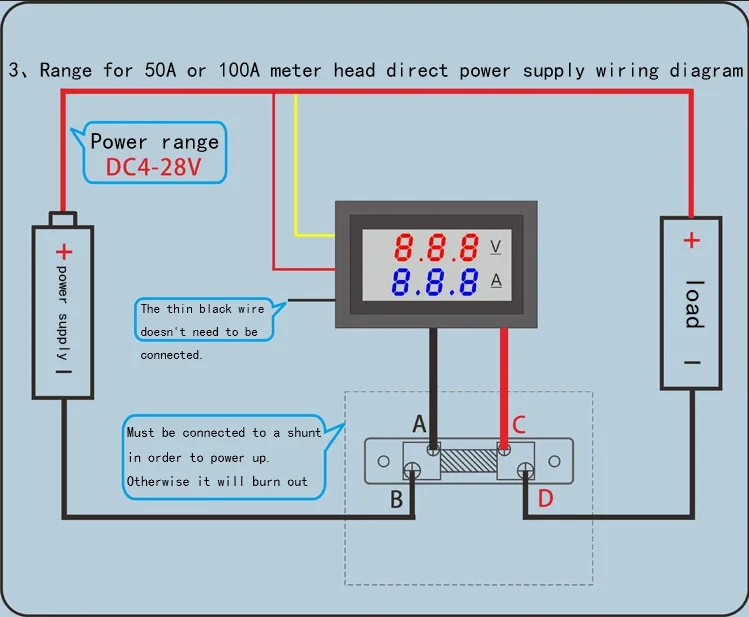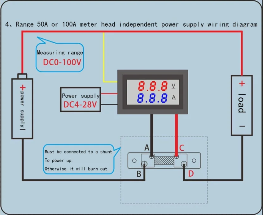 1. the range of 50A or 100A meter head must be connected to the shunt to power up, otherwise it will burn out. Buy 50A 100A customers will use. Customers who do not even buy a shunt, please note. Look at the wiring diagram. Please do not shoot if you do not know how to use it. Our samples do not accept returns. Small business please be merciful.