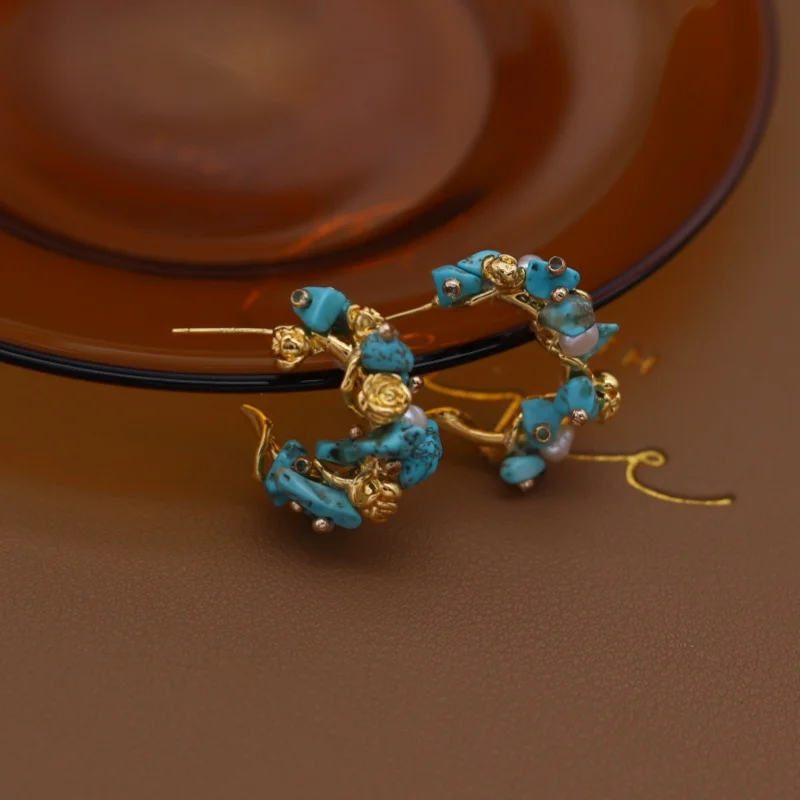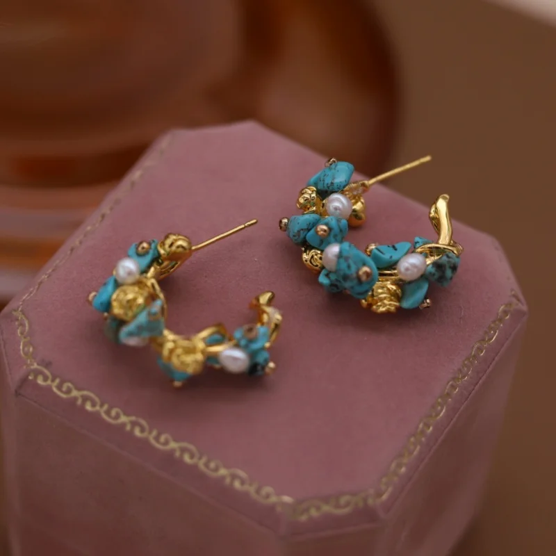 French new design retro jewelry 14K gold plated blue stone freshwater pearl wrap earrings elegant women’s daily work accessories