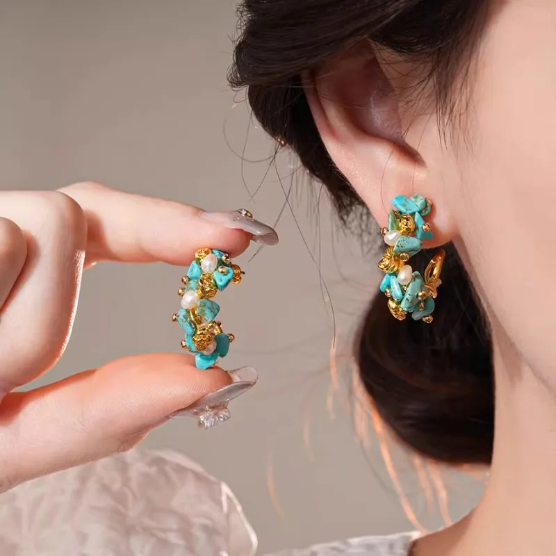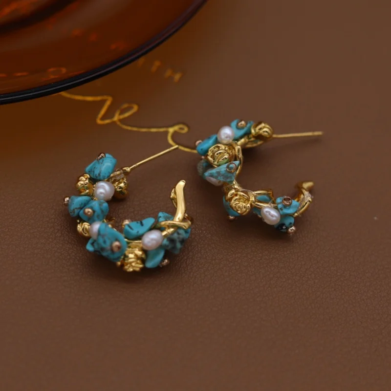 French new design retro jewelry 14K gold plated blue stone freshwater pearl wrap earrings elegant women’s daily work accessories