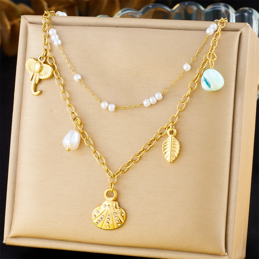LAMENGLY 316L Stainless Steel 2-chain Pearl Shell Sun Fish Pendant Necklace Women Summer Leisure Style Clavicle Chain Party Gift