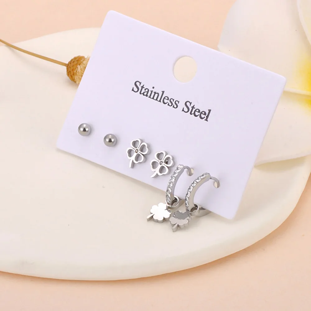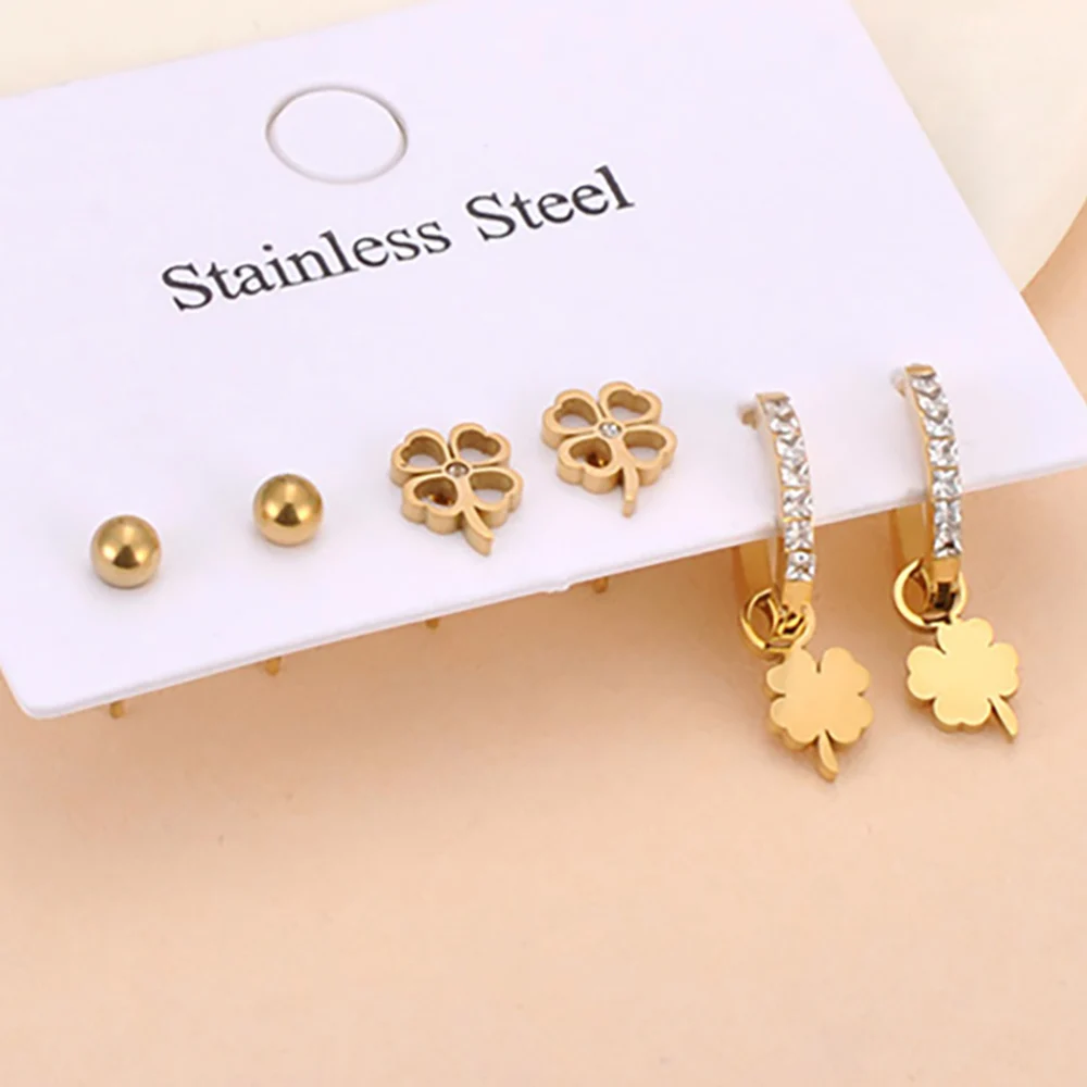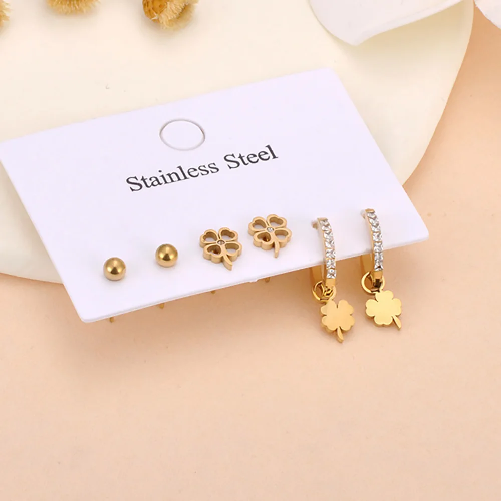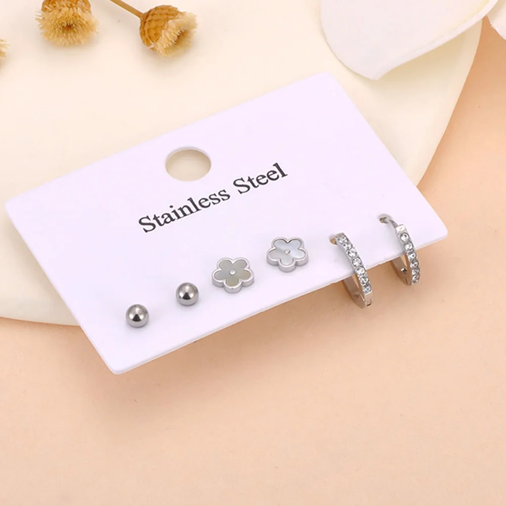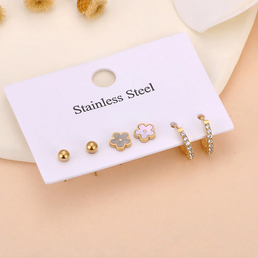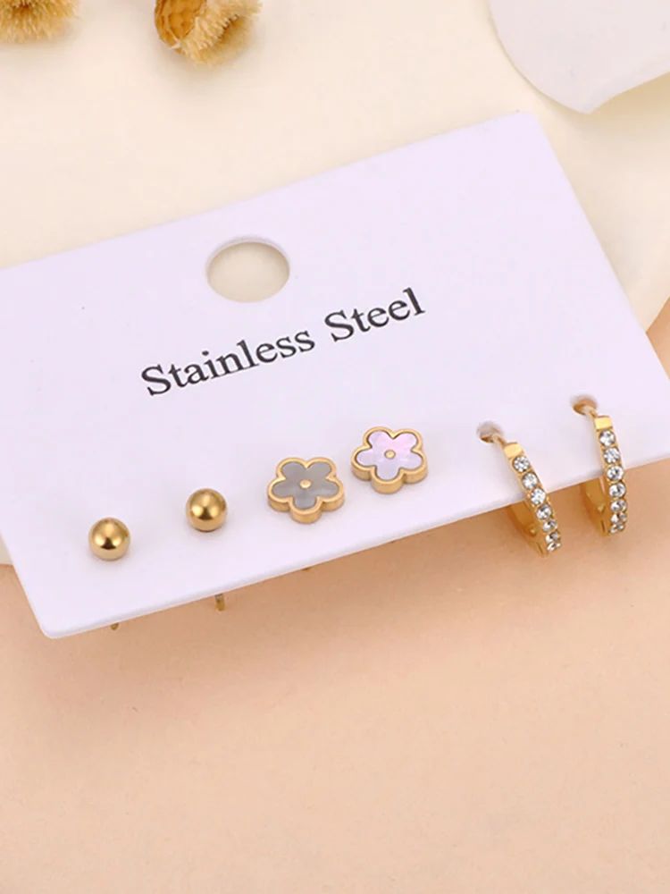 Lokaer 3Pair/Set Trendy Shell Flower Rhinestone Stud Earrings for Women 18K Gold Plated Stainless Steel Jewelry Wholesale E25007