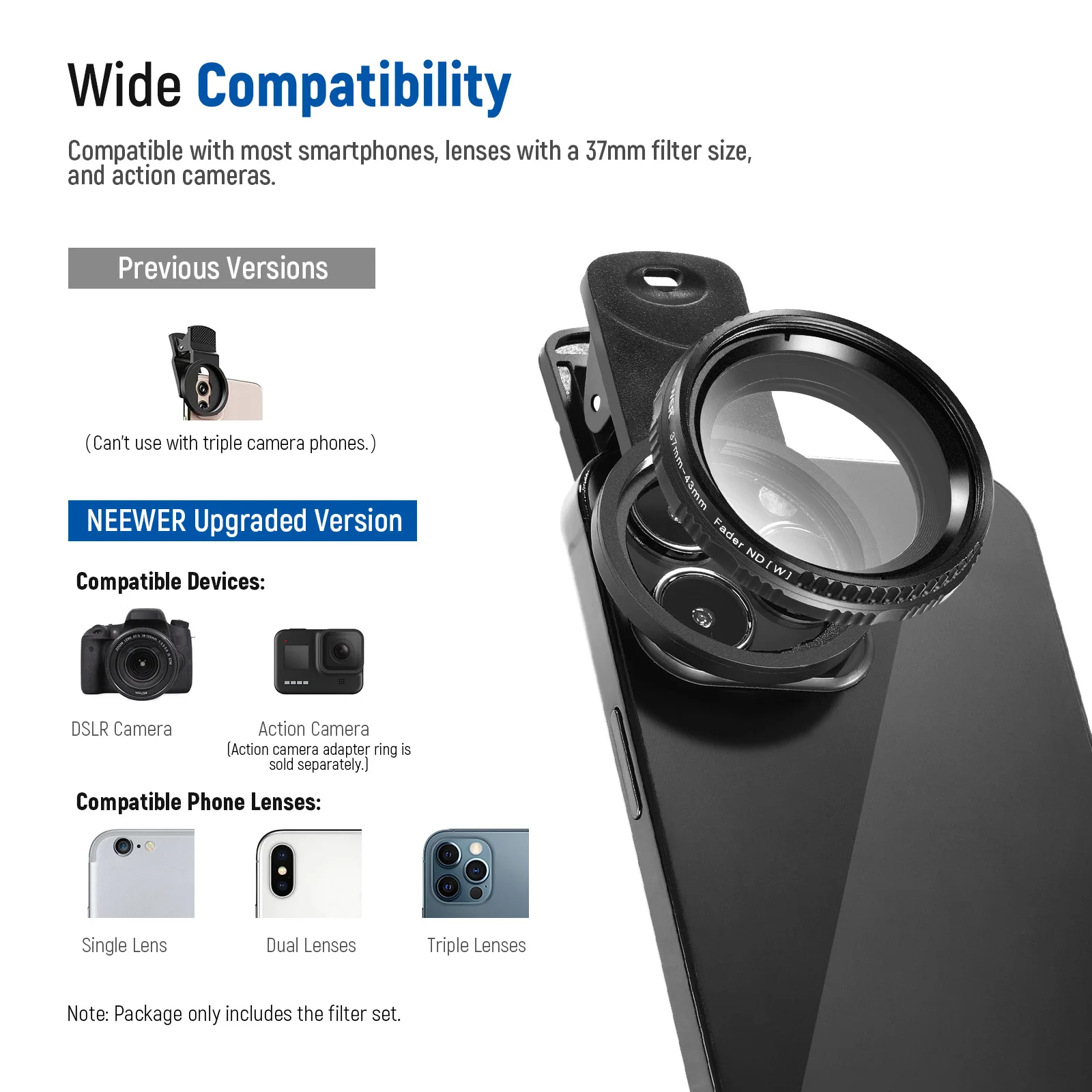 NEEWER 37mm Clip On ND2-ND400 Phone Camera Lens Filter Kit: Adjustable Neutral Density Filter with Phone Clip