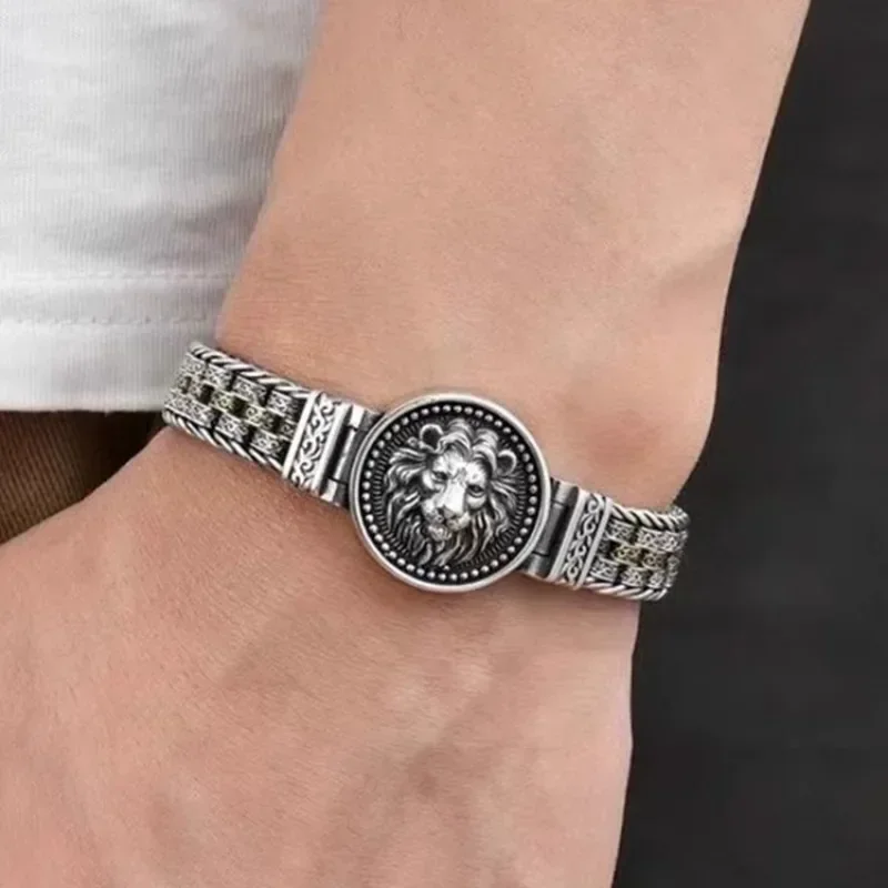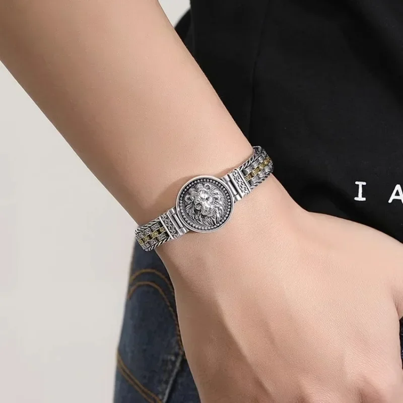 New Silver Color Round Lion King Tangcao Charm Bracelet Men’s Trendy Retro Domineering Versatile Personalized Braided Jewelry