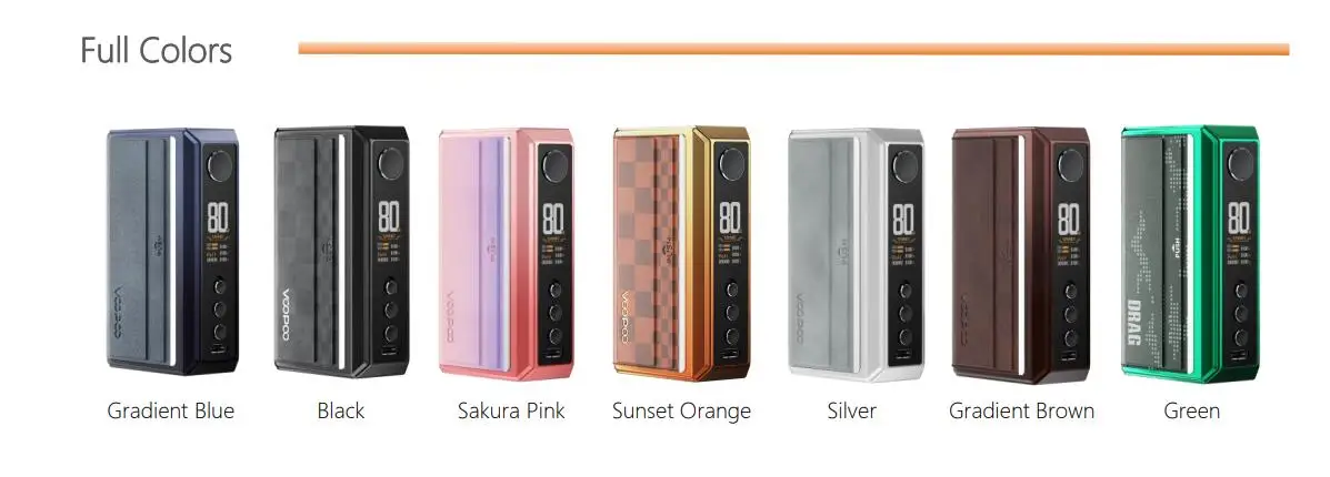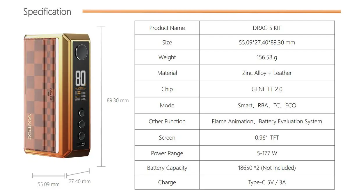 Drag 5 Mod applies GENE TT 2.0 chip, is powered by dual 18650 battery (not included). It supports Smart/RBA/ECO/TC mode. With 3-in-1 flip switch design, you can lock the device, lock the power, and switch the device on and off with one button. Five theme UI colors are designed for you to choose: Yellow, Orange, Pink, Purple, and Green. Battery evaluation system shows you the device's battery is suitable for continued use or not.