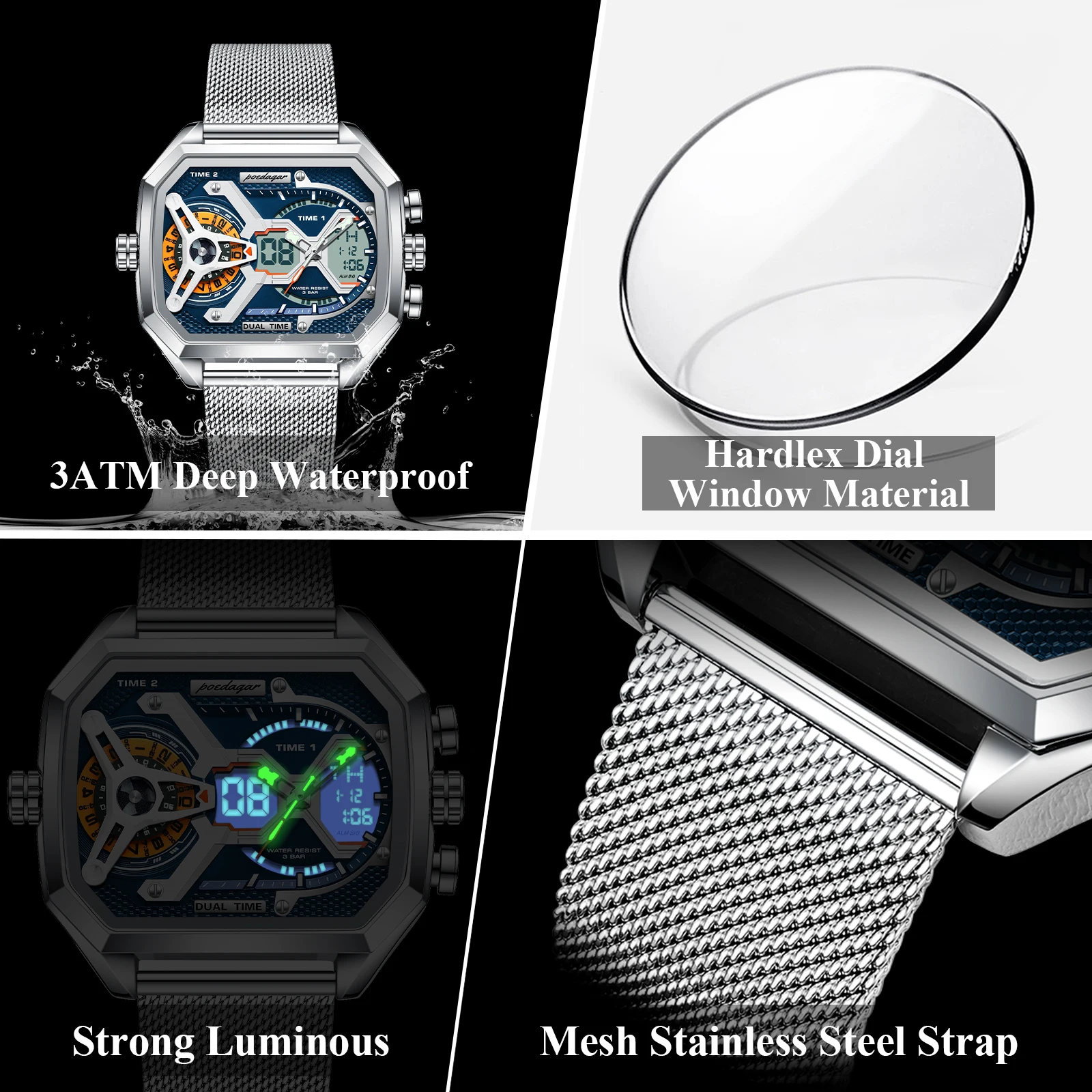 - Feature: Led Display,Luminous,Auto Date,Chronograph,Complete Calendar,Multiple Time Zone,Water-Resistance,Alarm,swim,Week Display,Luminous Hands