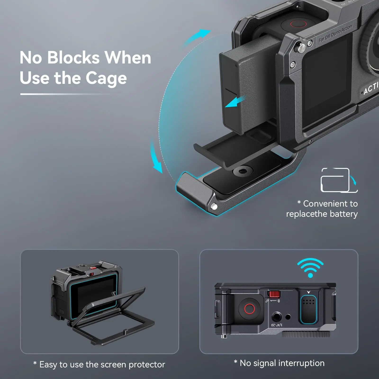 1. Dedicated full cage for DJI Osmo Action 5 Pro,DJI Osmo Action 4 and 3 action cameras, provides protection and mounting solutions;
