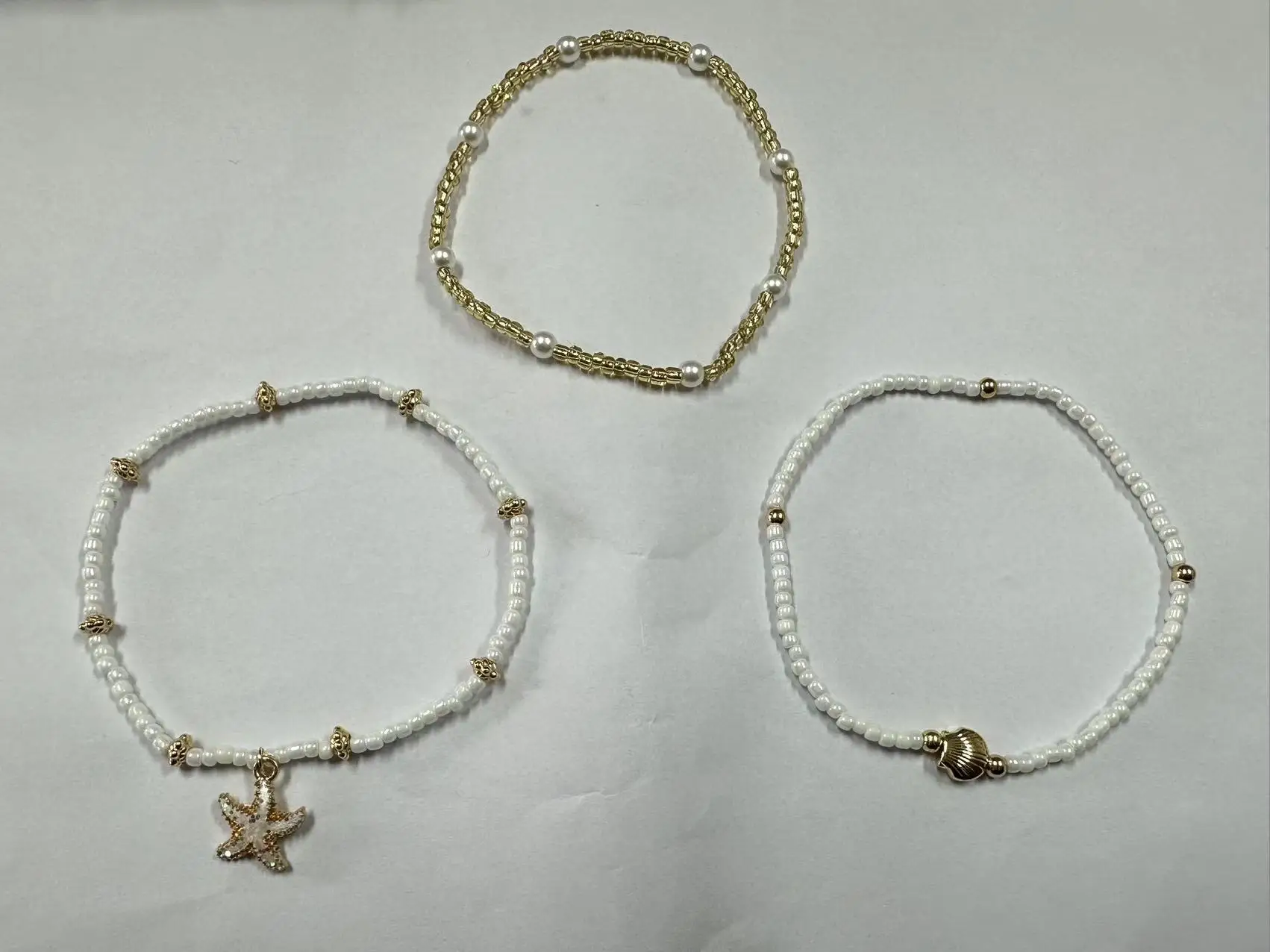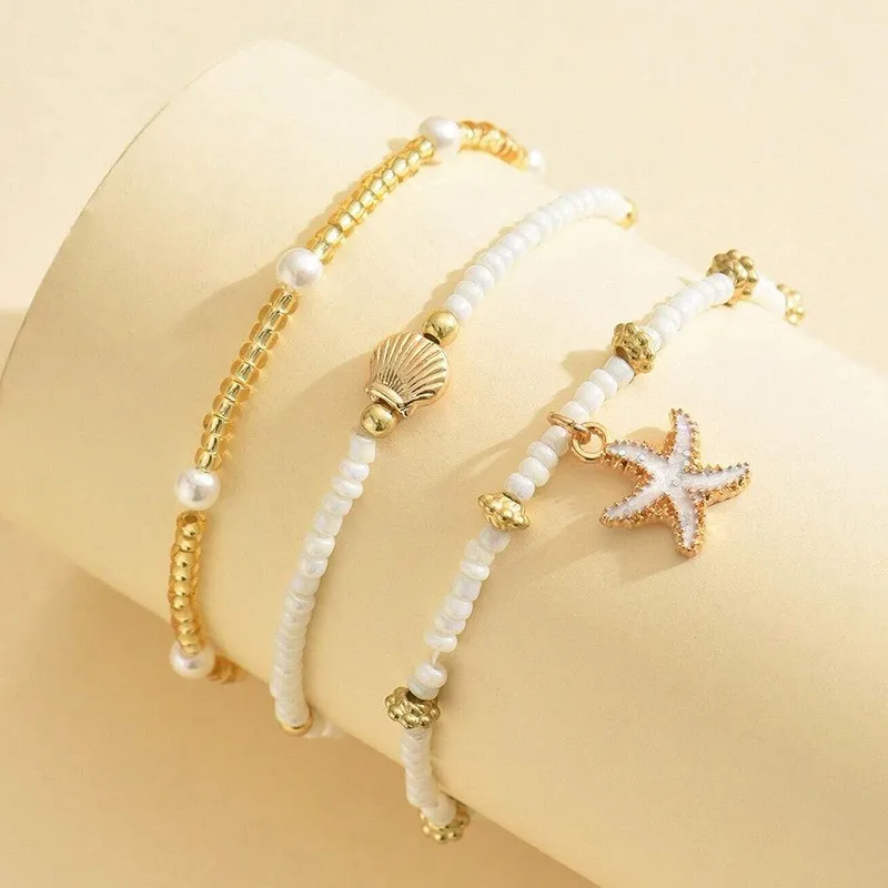 Summer Bohemian Style Starfish Shell Millet Bead Ankle Chain Three-Layer Set Beachy Elegant Foot Jewelry Accessory