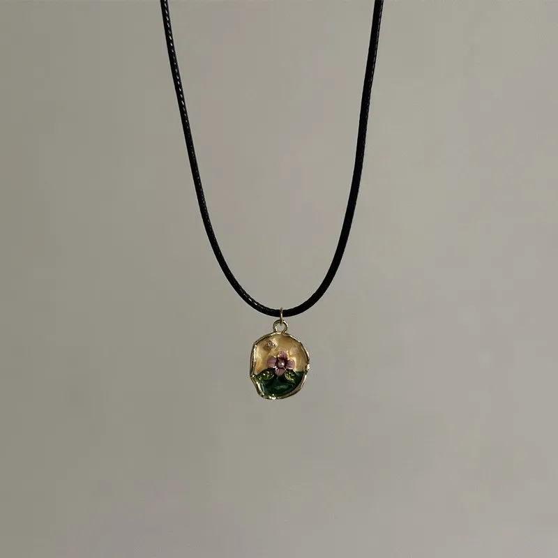 Vintage Drip Oil Flower Sun Pendant Necklace Leather Rope
